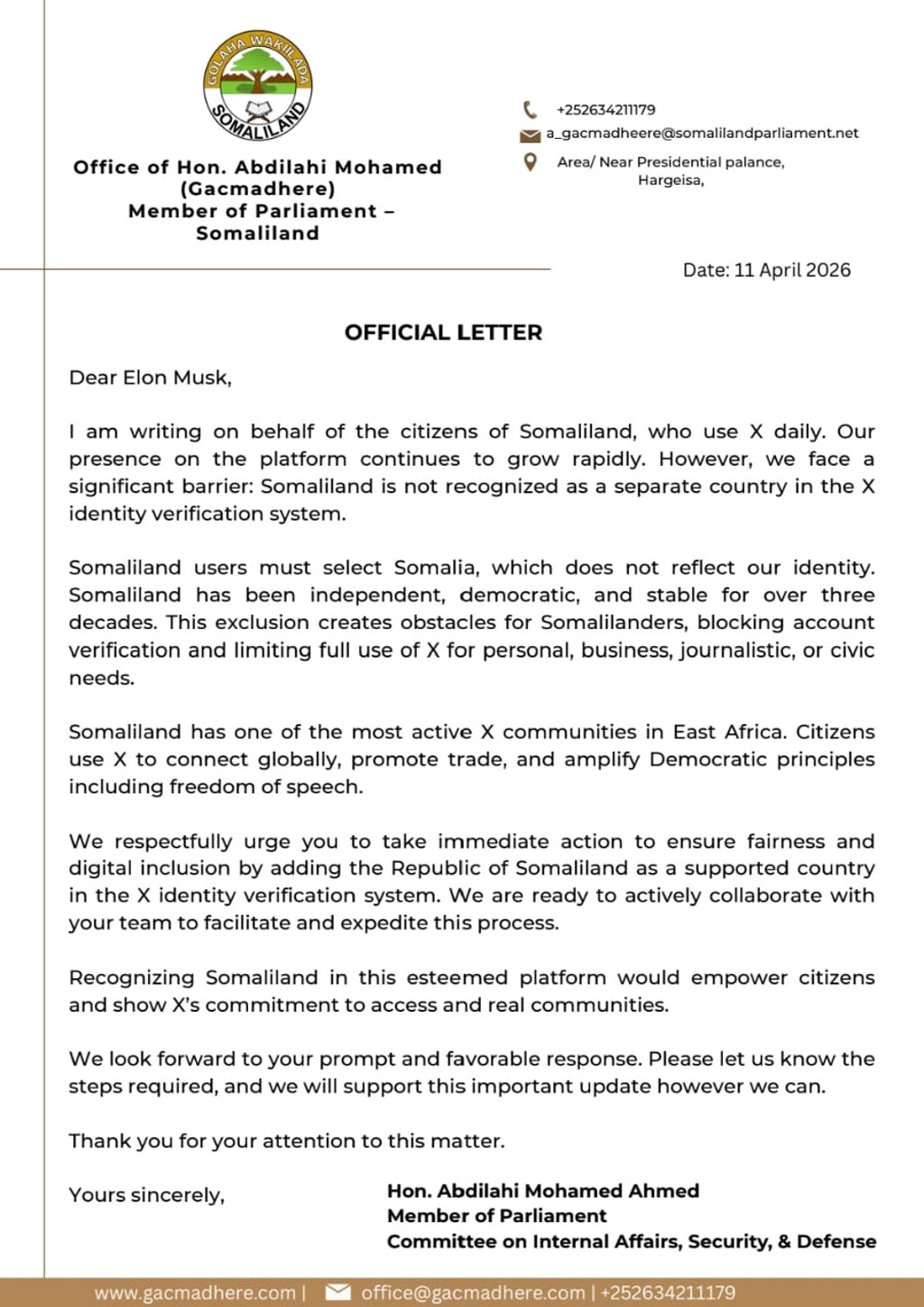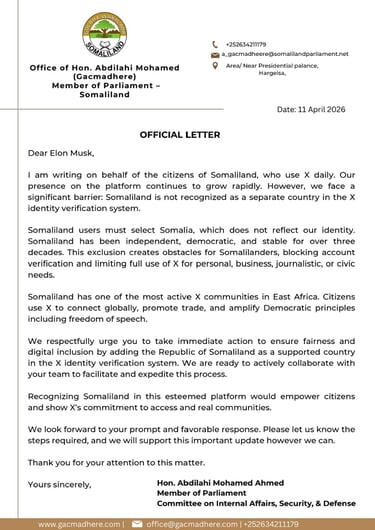 We respectfully urge you to instruct your team to add the Republic of Somaliland as a supported country in the X identity verification system, ensuring fairness and digital inclusion. We are prepared to collaborate with your team to provide any needed information or contacts to facilitate this process.